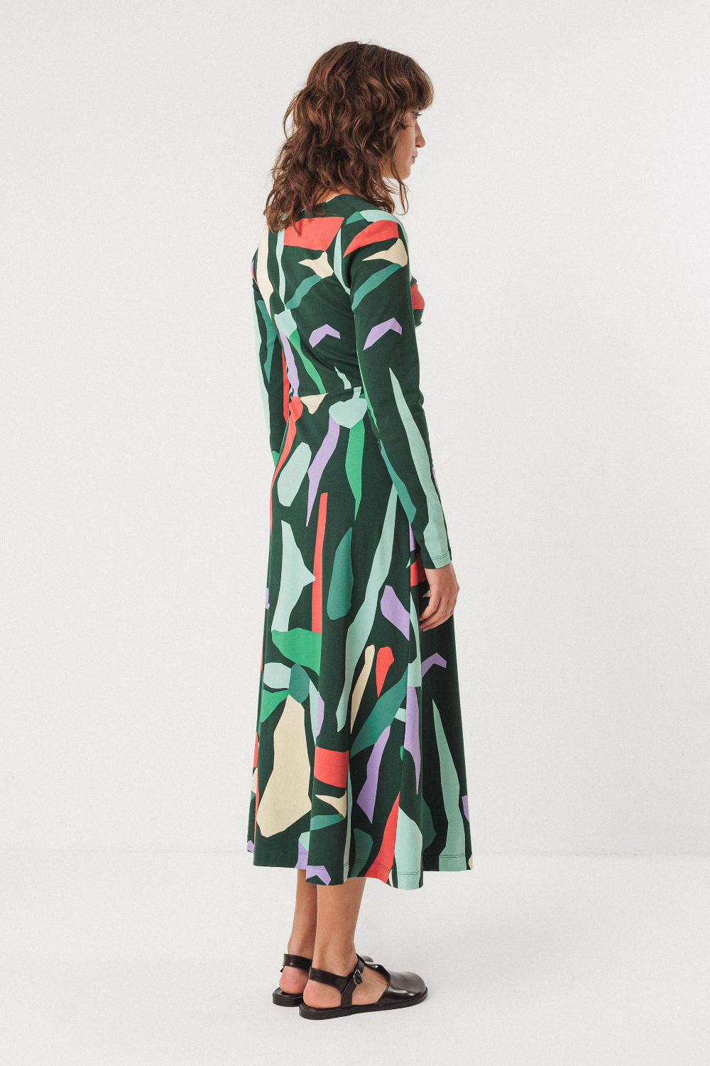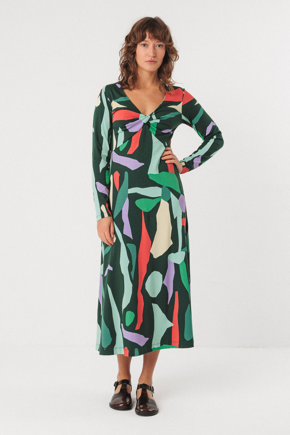 Vestido midi de algodón orgánico stretch. Es de manga larga y tiene el cuello de pico.