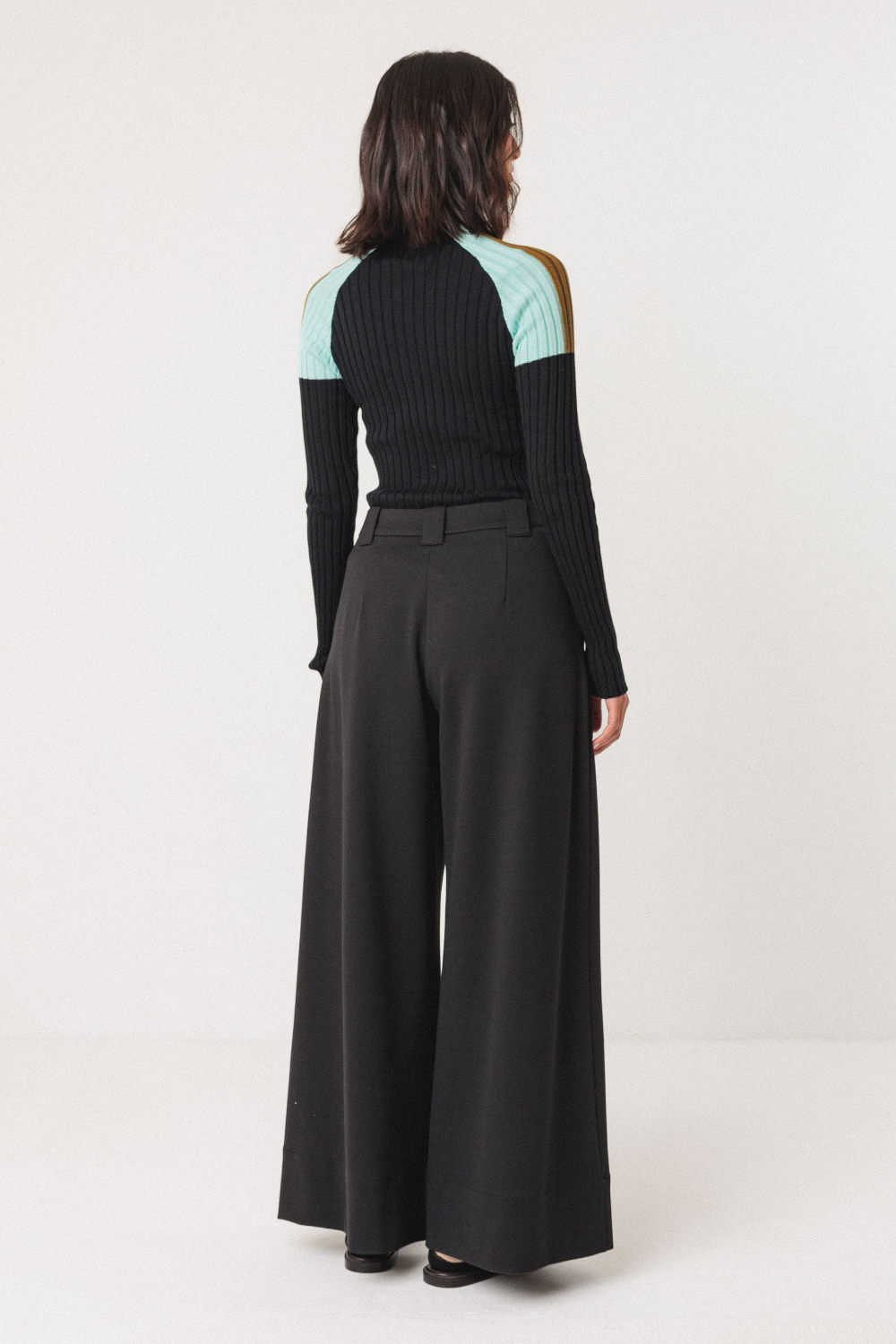 Camiseta de manga larga de punto de canalé fino con cuello alto y parches de color en contraste.