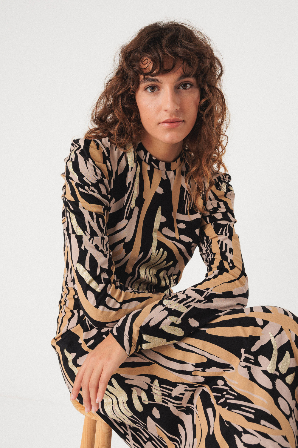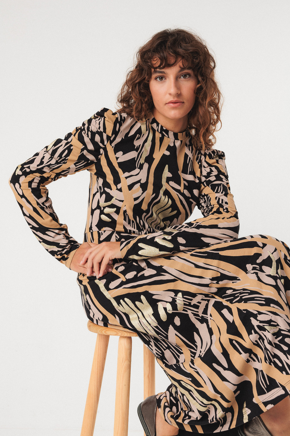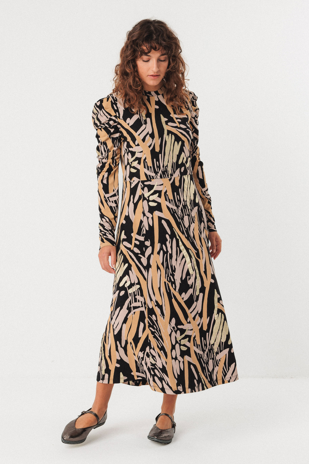 Vestido midi de algodón orgánico stretch. Tiene las mangas largas con unos frunces en los hombros y la falda acampanada.