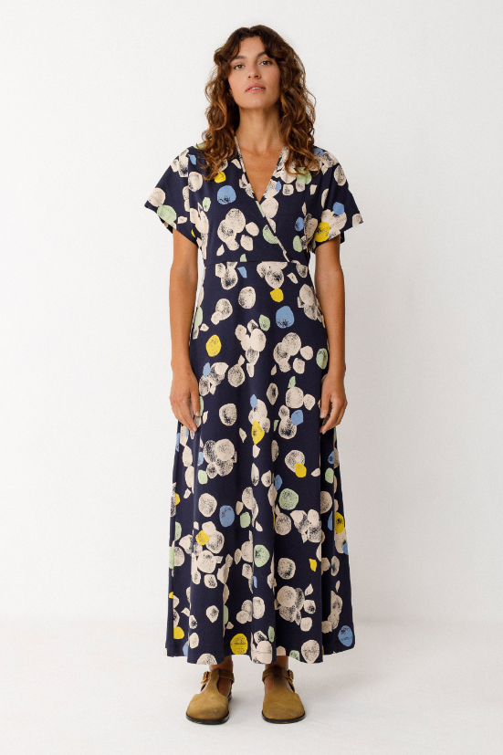 Vestido midi acampanado de manga corta, talle alto y corte kimono. Algodón orgánico con certificado GOTS.