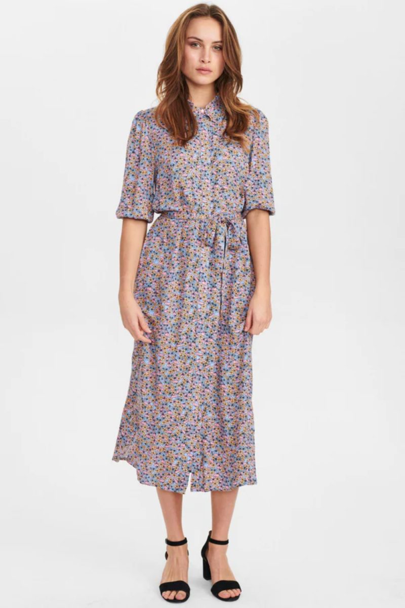 Vestido largo camisero de la firma danesa Nümph de manga francesa, cuello de camisa y cierre frontal con botones. Tiene un cinturón para ajustarlo a tu gusto y un precioso estampado floral en tonos pastel.