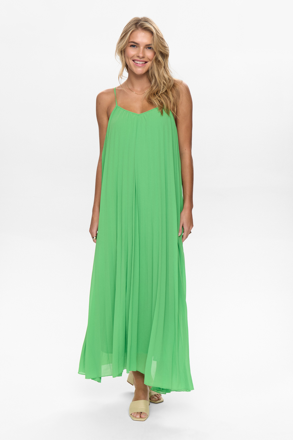 Vestido largo de la firma danesa NUMPH en color verde brillante. Con un diseño fluido y ligero, este vestido de corte recto y sin mangas presenta tirantes finos y un detalle de lazo en la parte trasera que añade un toque único al diseño. La tela plisada aporta un movimiento elegante, ideal para ocasiones informales y de verano.