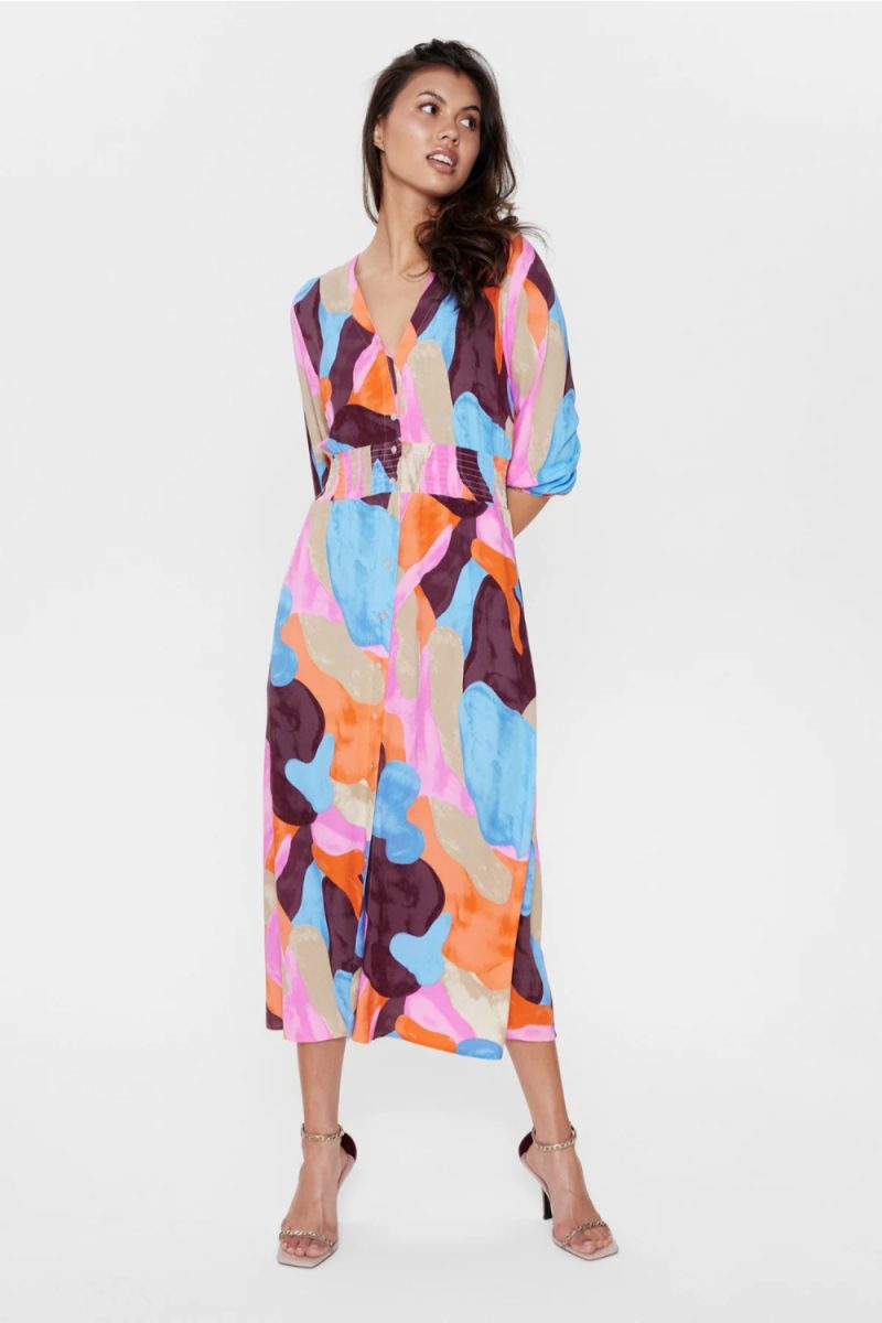 Vestido largo de la firma Nümph con manga 3/4 y fruncido en la cintura. Es abotonado en el frente con cuellos en V y estampado multicolor.