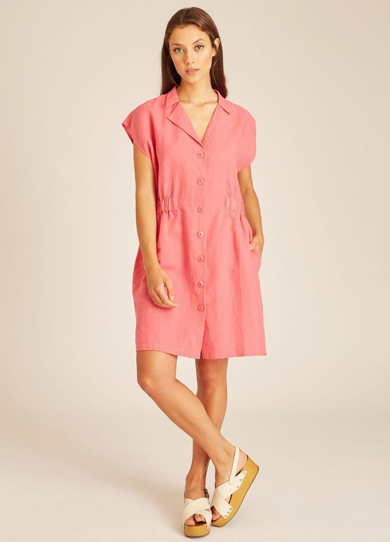 Vestido camisero de la firma PEPALOVES, abotonado en la parte delantera, con cuello de pico y entallado en cintura. Con un bonito color fucsia, es prenda preciosa, muy ponible y cómoda.
