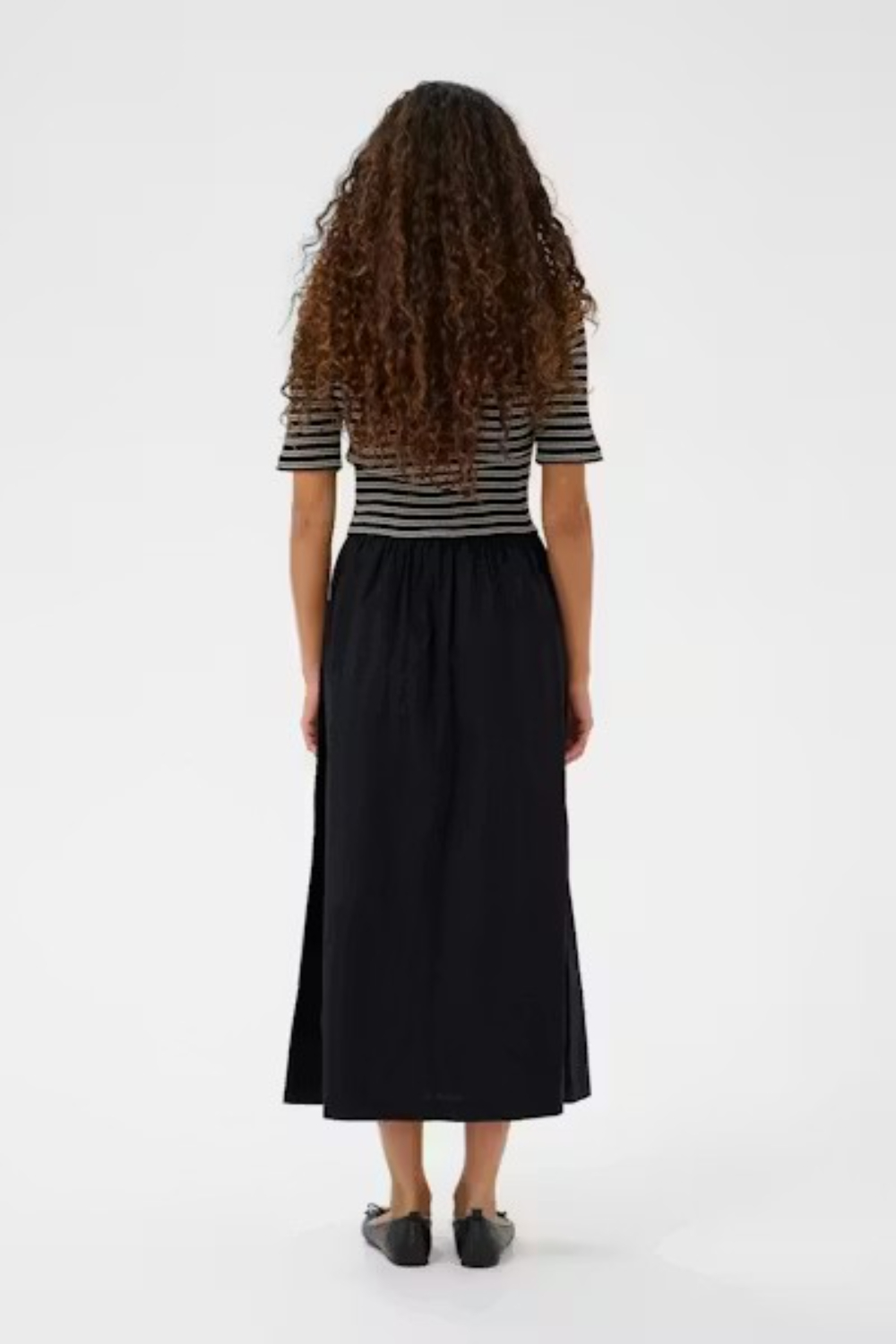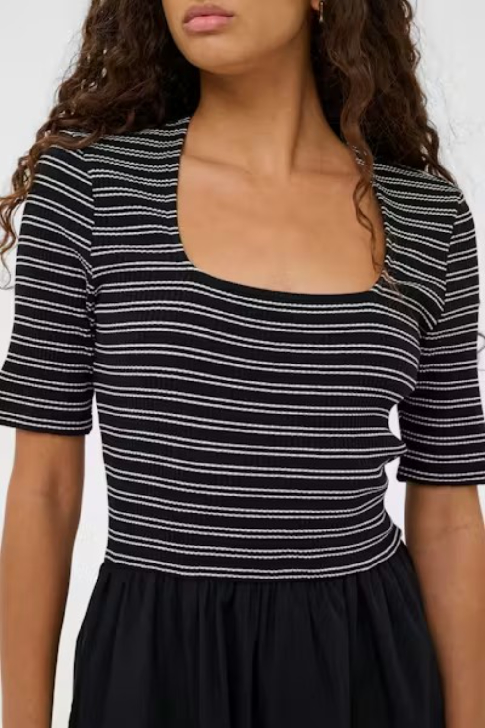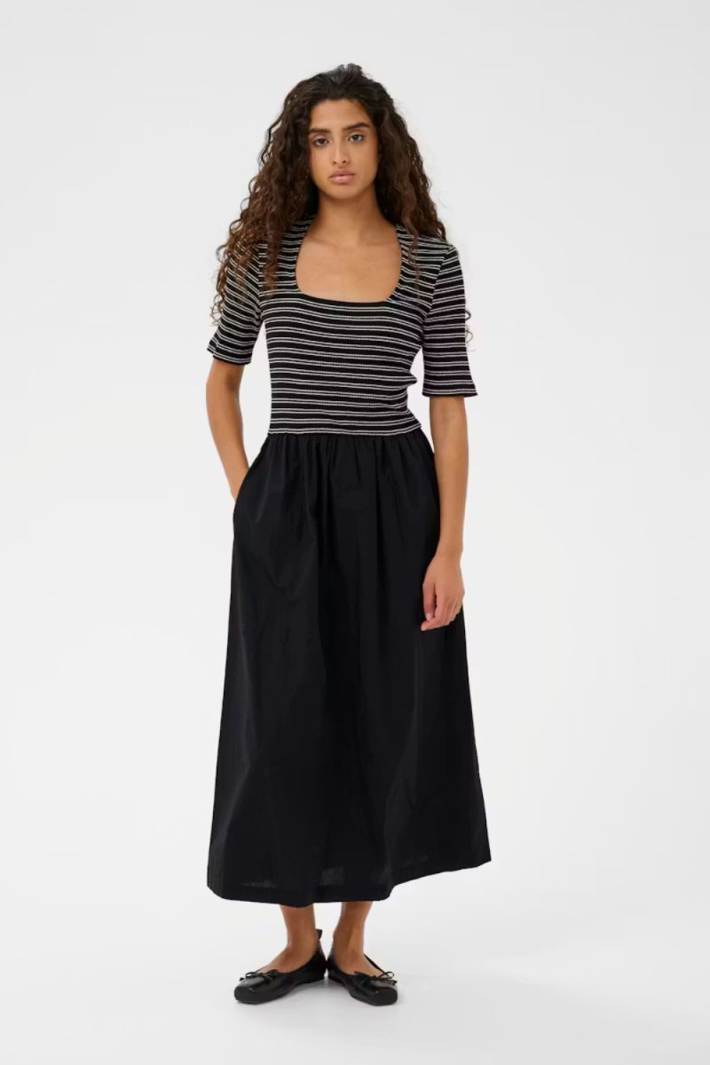 Vestido midi con cuerpo ajustado de canalé a rayas, escote cuadrado y manga corta. En contraste con una falda evasé fruncida y fluida que crea un contraste elegante con la silueta. Cuenta con bolsillos a los laterales para hacer el vestido mucho más práctico.