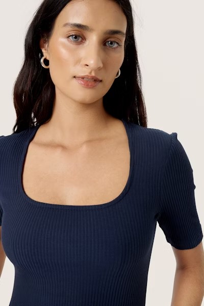 Vestido azul marino de la firma SOAKED con corpiño fruncido y escote cuadrado. El top de canalé se ajusta al cuerpo, mientras que la falda tiene una caída fluida.