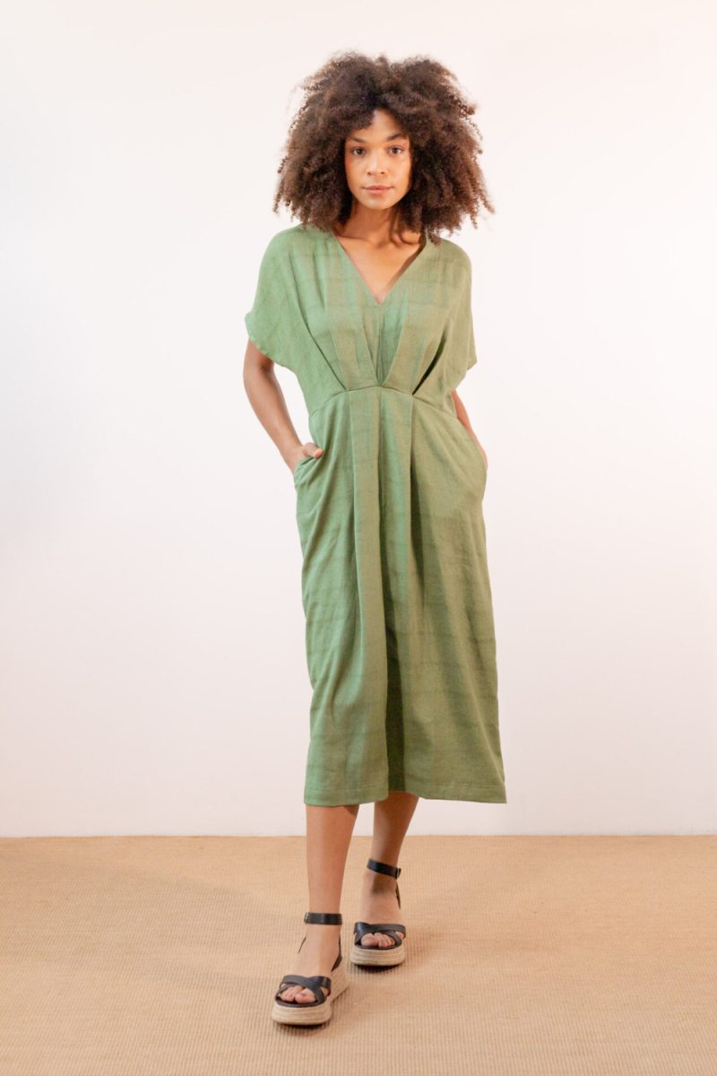 Vestido largo con cuello de pico de PAN. Lleva un corte debajo del pecho que recoje 3 pinzas. Es de hombro caído y sin mangas. La espalda tiene una cremallera larga naranja. El tejido hace una raya sutil y tiene peso y caída. Diseñado en España y made in Portugal.